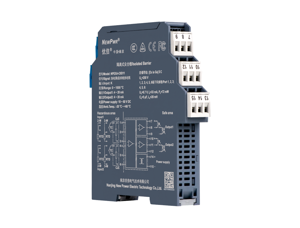 Temperature input isolated barrier, it converts the thermocouple/thermal resistance signals from a hazardous area into 4~20mA signals to a safe area by isolation. It has external cold junction compensation terminals. It needs an independent power supply. The input, output, and power supply are galvanically isolated from each other. The self-test function is also available on this device. Calibrate the apparatus or modify parameters by using a handheld programmer.ation terminals. It needs an independent power supply.