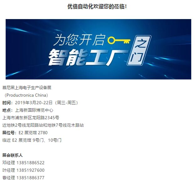 Productronica China特約展商南京優(yōu)倍自動(dòng)化系統(tǒng)有限公司(簡(jiǎn)稱(chēng):優(yōu)倍自動(dòng)化)以“電子產(chǎn)線MES與裝備集”成為展示主線,基于智能制造,啟用大型電子看板、軟件使用體驗(yàn)、現(xiàn)場(chǎng)問(wèn)答、案例回顧解析等方式,向來(lái)賓全面展示優(yōu)倍MES V2.0系統(tǒng)版本所具備的八大功能模塊:物料管理、產(chǎn)品工藝、生產(chǎn)管理、質(zhì)量管理、設(shè)備管理、可視化管理、信息集成、系統(tǒng)管理。